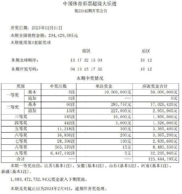 北京时间12月11日晚,体彩大乐透第23142期开奖,当期开奖号码为:前区04 13 15 17 32;后区10 12。本期全国销量为2。9亿元。