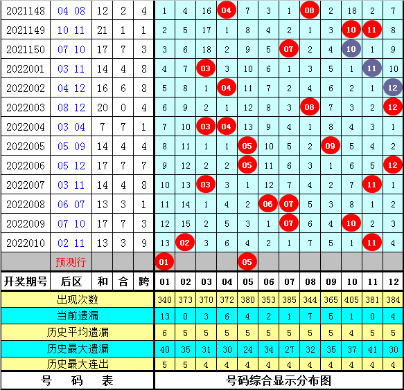 后区5码参考:01 04 05 10 11
