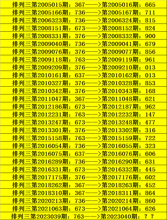 第2023039期排列三奖号为763,历史上该号码组选开出28次,下期奖号分别为:665、711、815、824、900、679、856、961、013、013、853、168、621、962、147、477、316、722、323、606、631、445、602、452、864、860、626。