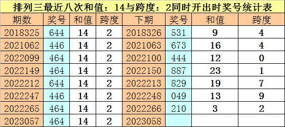 开奖回顾:体彩排列三第2023057期奖号为:464。和值为:14,跨度为:2。