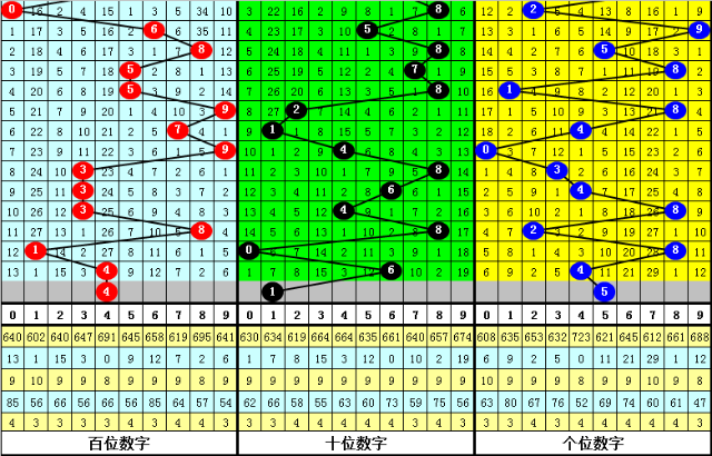 百位:下期百位1路号码开出次数较少,出现了1次,本期看好该位1路号码逐渐回补,参考号码4。