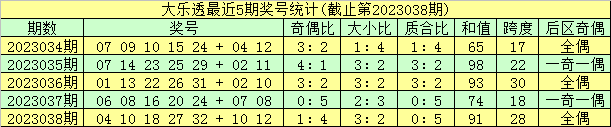 开奖回顾:体彩大乐透第23038期奖号为:04 10 18 27 32+10 12,前区奇偶比为1:4,大小比为3:2,和值为91,跨度为28,后区为全偶组合。