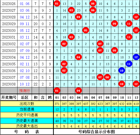 第2023039期后区奖号分析:后区最近五期开出奖号组合为:04+12、02+11、02+10、07+08、10+12,其中一奇一偶组合开出2次,全偶组合开出3次,全奇组合没有出现,本期后区关注一奇一偶组合,参考号码01、04。