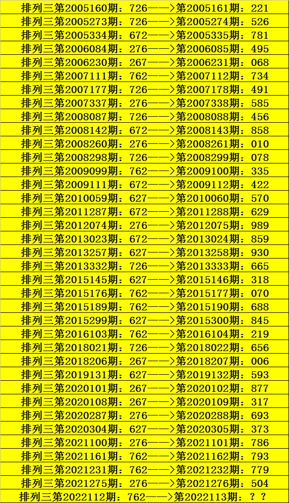 第2022112期排列三奖号为762,历史上该号码组选开出37次,下期奖号分别为:221、526、781、495、068、734、491、585、456、858、010、078、335、422、570、629、989、859、930、665、318、070、688、845、219、656、006、593、877、317、693、373、786、793、779、504。