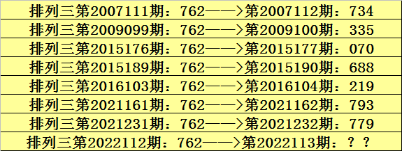 第2022112期排列三奖号为762,历史上该号码直选出现8次,下期奖号分别为:734、335、070、688、219、793、779。