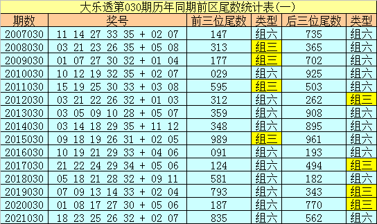 大乐透历年同期第030期开奖中,前区后三位开出尾数分别为:735-365-702-925-503-262-908-895-961-193-494-182-343-770-562,其中组六号码出现11期,组三号码出现4期,预计今年第030期同期前区后三位尾数号码开出组六号码;