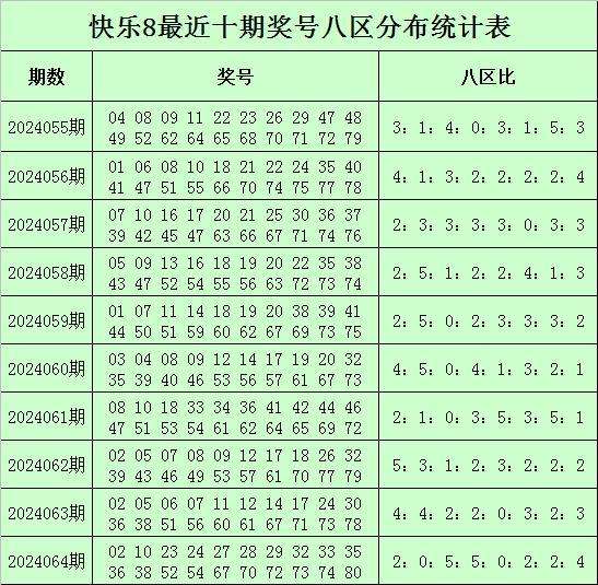 福彩快乐8第2024064期开奖回顾:02 10 23 24 27 28 29 32 33 35 36 38 52 54 67 70 72 73 74 80,其中奖号八区比为2:0:5:5:0:2:2:4。