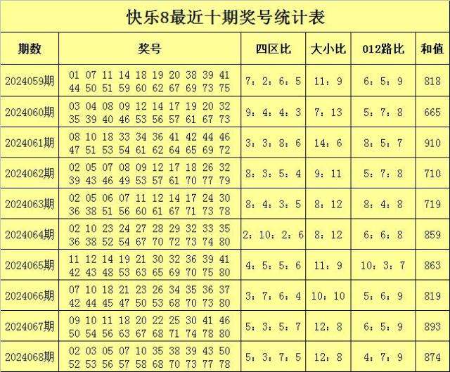 福彩快乐8第2024068期开奖回顾:02 03 05 07 10 35 38 39 43 50 52 53 56 57 58 68 70 73 77 78,其中奖号四区比为5:3:7:5。