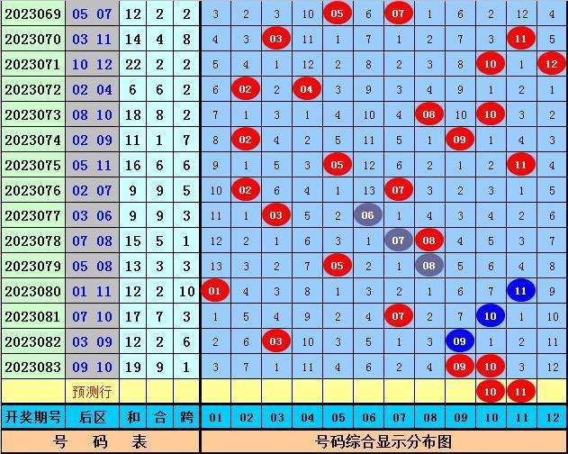 后区分析:上期开出后区奖号09+10,为一奇一偶组合,后区最近10期全奇、全偶和一奇一偶组合分别开出3次、0次和7次,本期后区防一奇一偶组合再出,参考号码10、11。