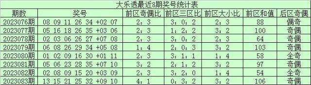 大乐透第2023083期奖号为:前区:13、15、21、25、32,后区:09、10。其中前区奇偶比为4:1,大小比为3:2,三区比为0:3:2,和值为106。