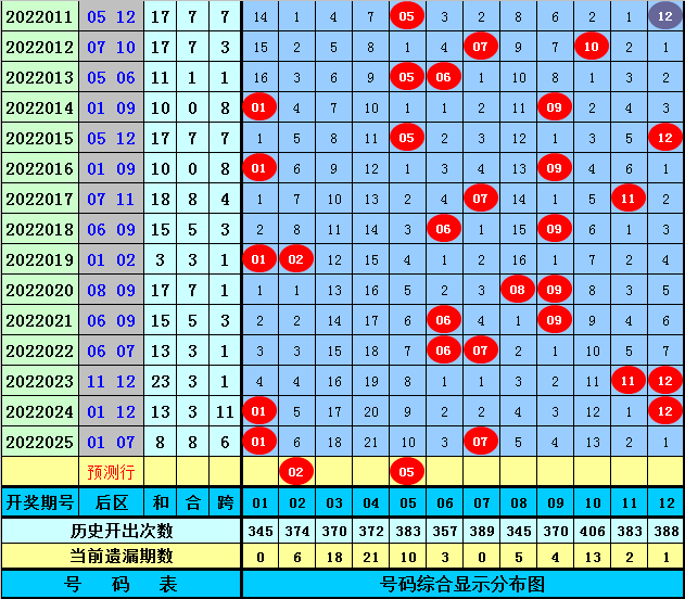 后区分析:上期后区奖号为01+07,遗漏期数为0期+2期。,目前后区热码有5个:01、06、07、11、12,后区温码有3个:02、08、09,后区冷码有4个:03、04、05、10,本期后区看好号码02、05、06、07、09,单挑一注02+05。