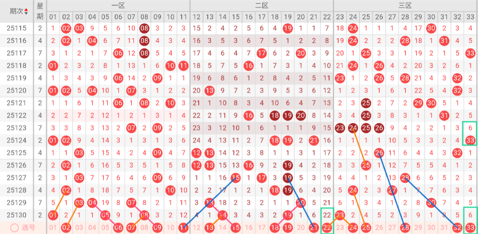 第三区间(23-33):三区上期开出号码23,近5期出号量1-1-2-1-1。本期无三连号趋势,隔码斜连趋势:28 32。近5期平均出号1.2枚,平均出号减少。该区间已连续5期在1-2码的低位运行,且近5期中有4期开出1码,明显偏冷。概率论上,这种极端低迷状态具有极强的不可持续性。建议关注号码:24、25、28、32、33。