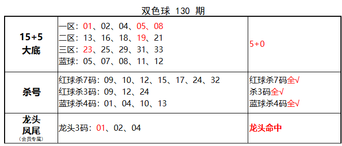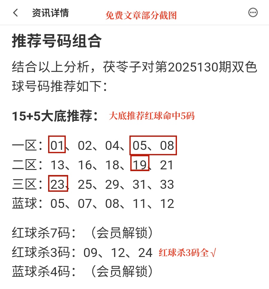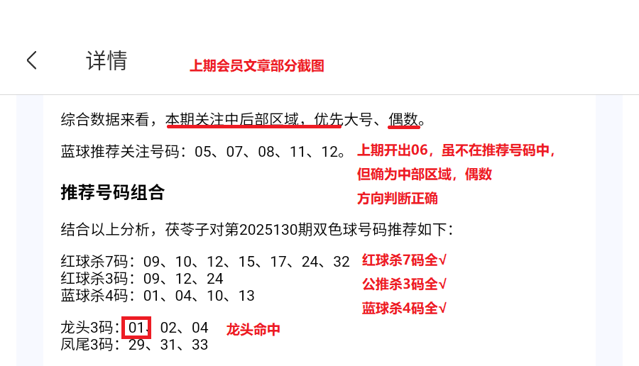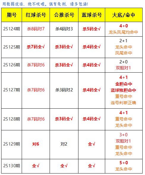 上期红球杀7码全对,免费文章杀3码全对,蓝球杀4码全对,龙头命中,上期红球命中5码,本期再接再厉!