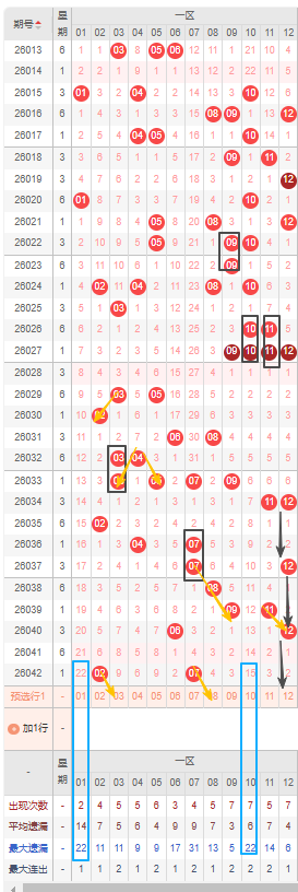 本期一区首先建议关注隔断号,比如12号本期若开出则形成2-2-2的形态可以防本期开出。另外可以考虑冷号,比如01号、10号都是已经遗漏十期以上且达到最大遗漏值的号,建议防冷号开出。由于上一期开出了两码的情况,邻号可以考虑上期开出号码相邻的03号和08号。