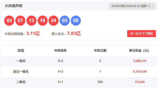 大乐透第2026042期开奖号码如下图: 开出一等奖5注,奖池累计奖金:7.83亿元 ,详细数据见下图: