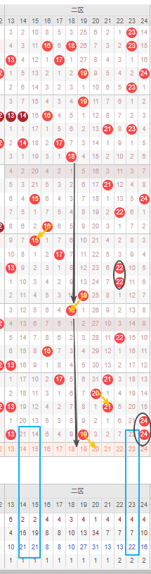 二区本期选号首先考虑冷号14号、15号,如图所示当前两个号都已遗漏十期以上,并且还达到了自身的最大遗漏期数可防冷号开出,23号同样遗漏十期以上,也远超最大遗漏周期,建议都防冷号开出。总之本区多关注冷号就行。另外18号本期若开出则形成8-9的形态。由图可见二区的重号几率并不算很大,近20期开出了2次重号,上次开出重号虽然还没间隔很多期,本期也可以考虑上期开出的19号继续开出重号。