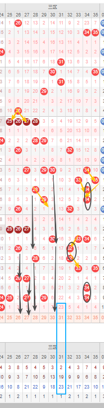 二区选号首先关注冷号31号,已经遗漏了十期以上,且到达自身最大遗漏周期,也已经远超平均遗漏期数,建议可以防冷号开出。另外本期三区个人觉得不会开超过三码,多关注该区冷号防冷号开出。本期由图可见隔断号非常多,可以考虑26号,若本期开出将形成2-3的形态。其次考虑27号,本期若开出则形成1-1的形态,同理28号若本期开出将形成6-5的形态,最后是30号,若开出将形成6-7的形态规律。