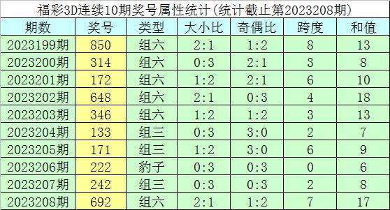 开奖回顾:福彩3D第2023208期奖号为692。奖号形态为组六,大小形态为大大小,奇偶形态为偶奇偶,和值为17,跨度为7。