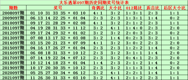 3、在历史同期第097期开奖中,前区号码大小总比例为40:30,大号表现相对较热,本期看好大号继续热出,关注大小比3:2出现;