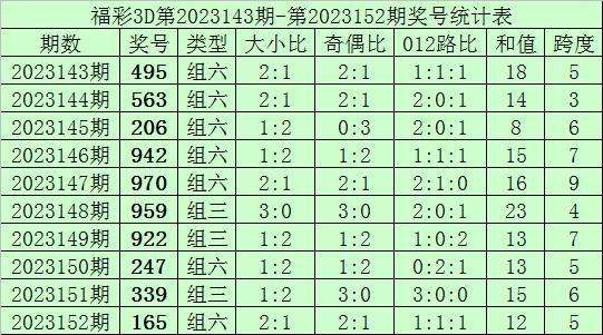 开奖回顾:福彩3D第2023152期奖号为165,其中奖号大小比为2:1,奇偶比为2:1,012路比为1:1:1,和值为12,跨度为5。