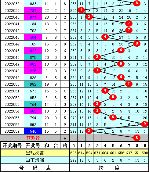 福彩3D第2022057期最大跨度开出2,近期最大跨度波动较大,本期预计最大跨度在5-9区段开出,最大跨度参考6789,一码跨度参考8。