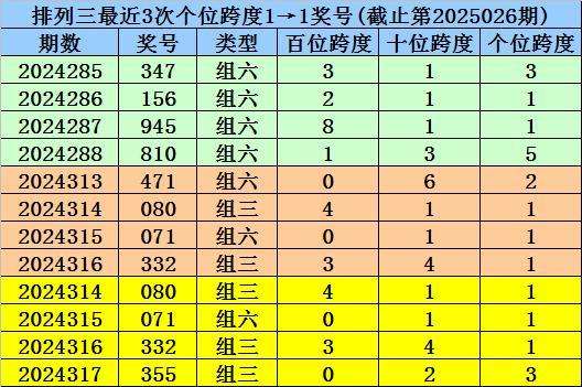 第2024313-第2024315期奖号:471、080、071,其下期奖号为:332,末位号码跨度为3;
