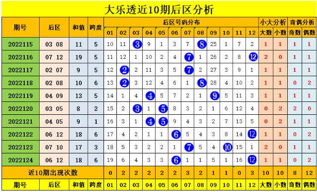 后区近10期大小比为10:10,大、小号码走势相同,上期开出小大组合,本期后区推荐小大组合;