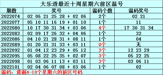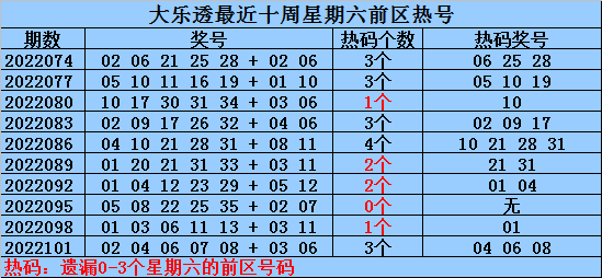 热号:最近十周星期六前区开出22个热号,上周星期六前区开出3个热号,本周星期六注意热号12 13。