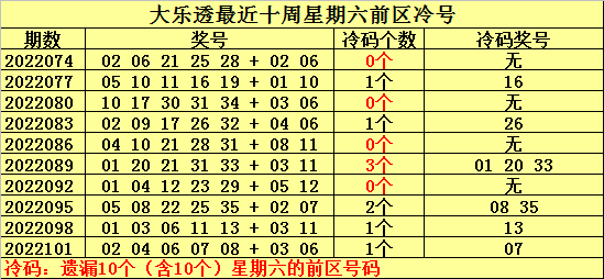 冷号:最近十周星期六前区开出9个冷号,上周星期六冷号出现1个,本周星期六放弃冷号出现的可能。