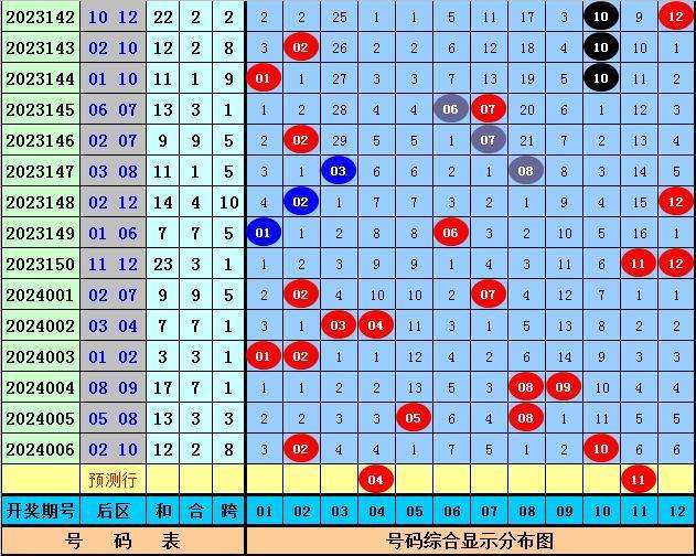 后区分析:后区开出奖号02和10,近5期后区奖号大小比为4:6,分别开出:全小、全小、全大、一大一小、一大一小,本期后区预计小号热出,关注全小组合04、11。