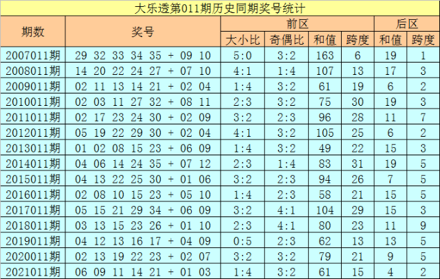 4、前区大小比分析:在第011期历史同期奖号中,前区奖号大小比为35:40,小号明显活跃,最近5年前区同期大小比为3:2、2:3、0:5、3:2、1:4,今年第011期注意小号热出,关注大小比2:3。