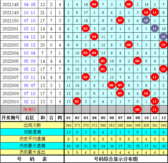 2、前区跨度分析:在第011期历史同期奖号中,前区跨度分布在6-31区段,分布比较广,其中跨度012路比为5:7:3,今年第011期预计开出2路跨度,精选跨度26。