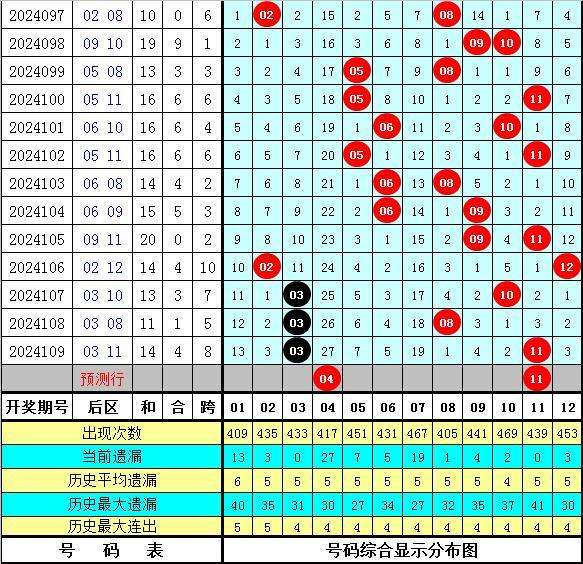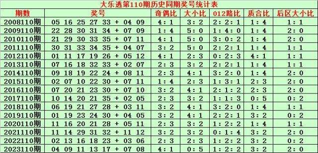 6、在历史同期第110期开奖中,后区全小组合出现3次,一大一小组合出现6次,全大组合出现7次,本期后区注意一大一小组合出现,关注号码04、06、10、11。