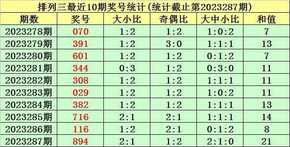 上期回顾:排列三第2023287期奖号为:894。奖号类型:组六,和值:21,奇偶比:1:2,跨度:5,大小比:2:1。
