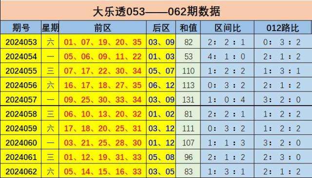 上期前区三区比为1:3:1,一区(1-12)开出1个号码,二区(13-24)开出3个号码,三区(25-35)开出1个号码;前区近10期三区号码比为14:18:18,1区出号较冷,2区出号较热,3区出号较热;综合分析推荐本期区间比为2:2:1。