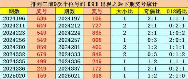 个位号码:上期奖号为大号、奇数、0路号码:9,历史上个位号码9共开出751期,前一次出现在第2025020期,上期遗漏8期再出。