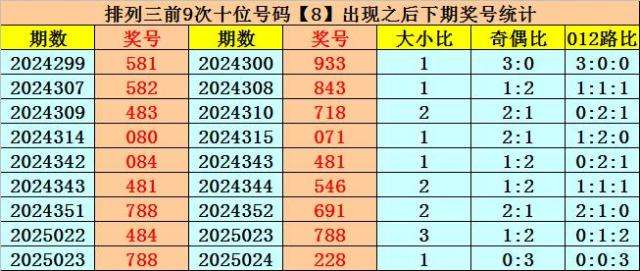 十位号码:十位上期开出奇数、大号、2路号码:8,历史上十位号码8共开出735期,上一次出现在第2025023期,上期奖号遗漏值为5期。