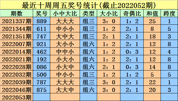 上期回顾:福利彩票3D第2022052期开奖结果053。奖号:偶奇奇、小大小,和值8,跨度5。