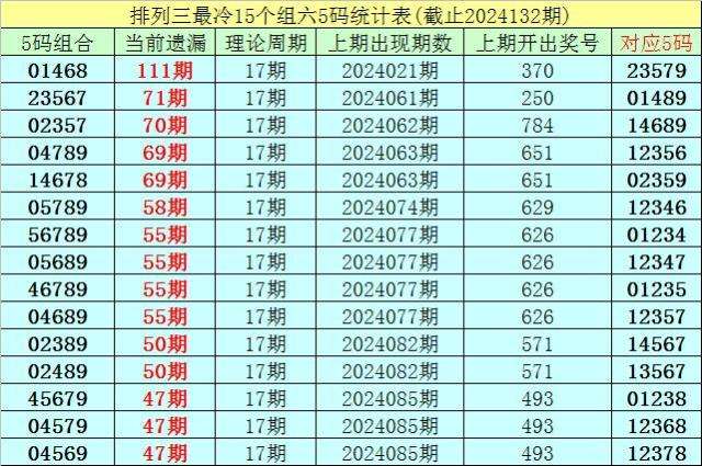 (5)排列三目前遗漏值最大的5码组六组合为:01468,本期遗漏111期,短期解冻的可能性较小,则24133期奖号分布在01468-23579之中的可能性最大。