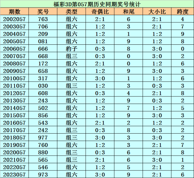 福彩3D历年第057期同期奖号为:763 706 209 081 666 668 172 658 317 030 608 243 502 856 543 242 977 760 880 565 546 973。