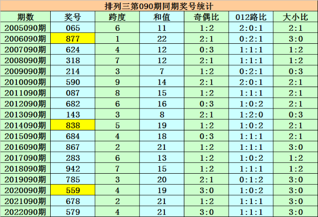上期回顾:排列三第2022090期奖号为579,组选类型为组六,奖号大小比为3:0,012路比为1:1:1,奇偶比为3:0。