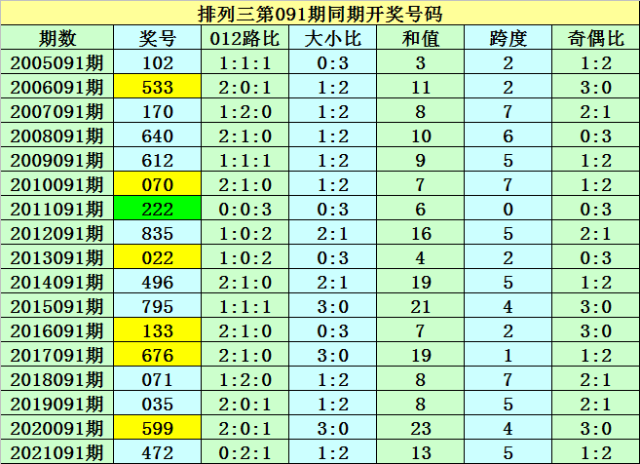 本期为排列三第2022091期开奖,开奖日期为:2022年4月11日,历史上排列三第091期已开出了17次奖号,历年同期开出号码分别为:102-533-170-640-612-070-222-835-022-496-795-133-676-071-035-599-472。