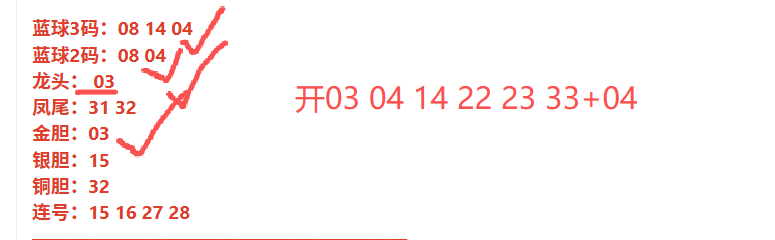 先回顾上期开奖号码:03 04 14 22 23 33+04。上期红球金胆03对,蓝球两码围中04等