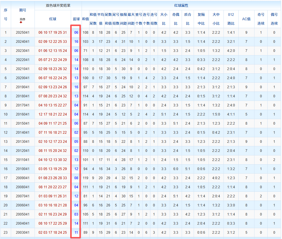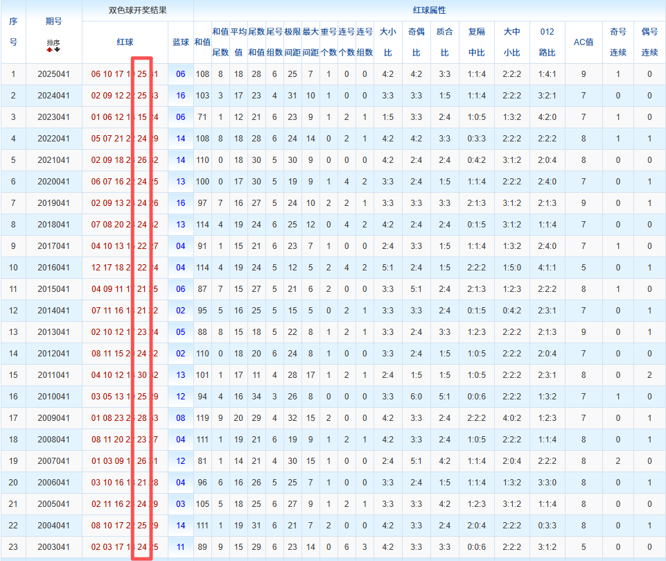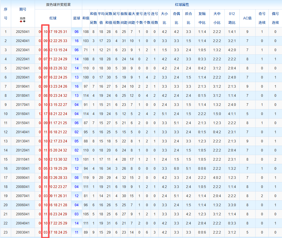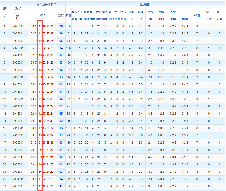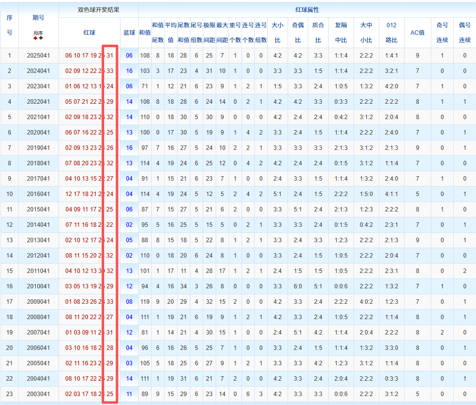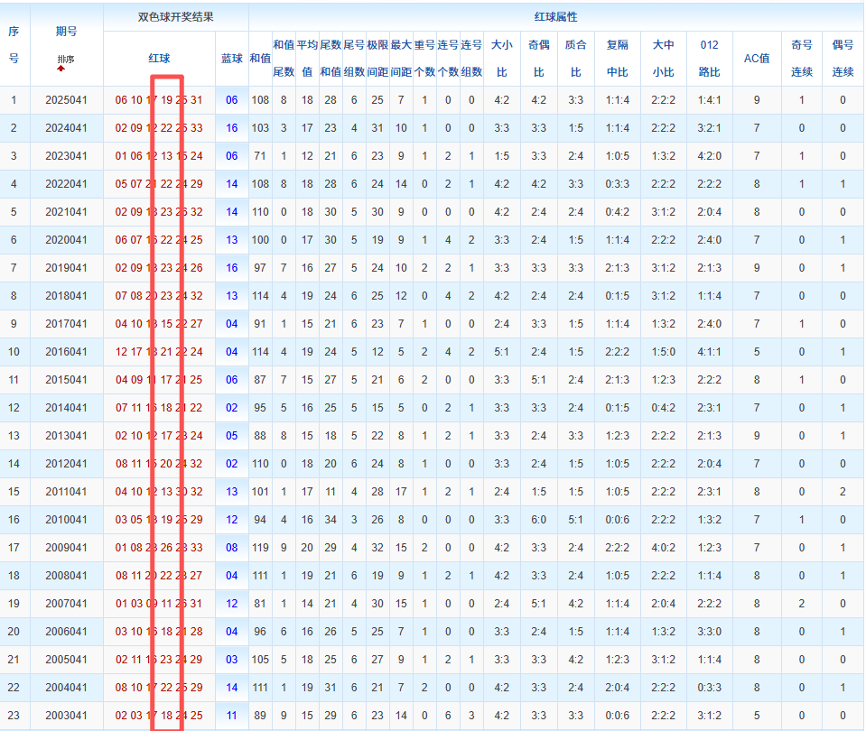 通过观察,我发现双色球往年同期的开奖数据与本期号码之间存在显著关联。具体来说,在红球中,从第一位至第六位,通常会有约4个位置上的数字与往年同期相同位置的号码一致;而蓝球号码中,也有多期开奖结果直接包含了往年同期的数字。因此,我们可以借助往年同期各位置上的号码,作为分析本期开奖情况的重要依据。在此基础上,还可结合往年同期的其他相关条件,进行综合性的号码组合推荐。