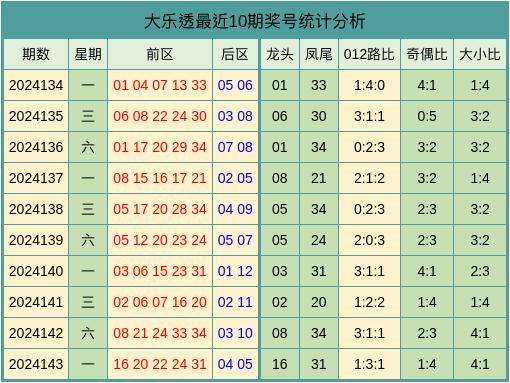 上期回顾:大乐透第2024143期:前区16、20、22、24、31;后区04、05,其中前区012路比为1:3:1,奇偶比为1:4,后区开出偶数号码04、05。