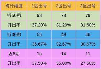 近50期,一区出号93个,二区出号78个,三区出号79个,三区数据比对1分区出号较多。