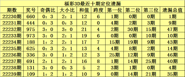 开奖回顾:福彩3D第2022239期奖号:109,百位号码遗漏0期、十位号码遗漏14期、个位号码遗漏21期,遗漏总值为35期。