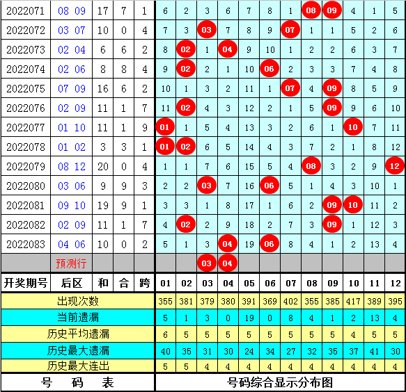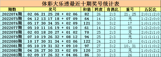 上期开奖:大乐透第2022083期奖号为:02 09 17 26 32 + 04 06,前区号码和值为86,跨度为30,奇偶比为2:3,重号:26,五区比为1:1:1:1:1。