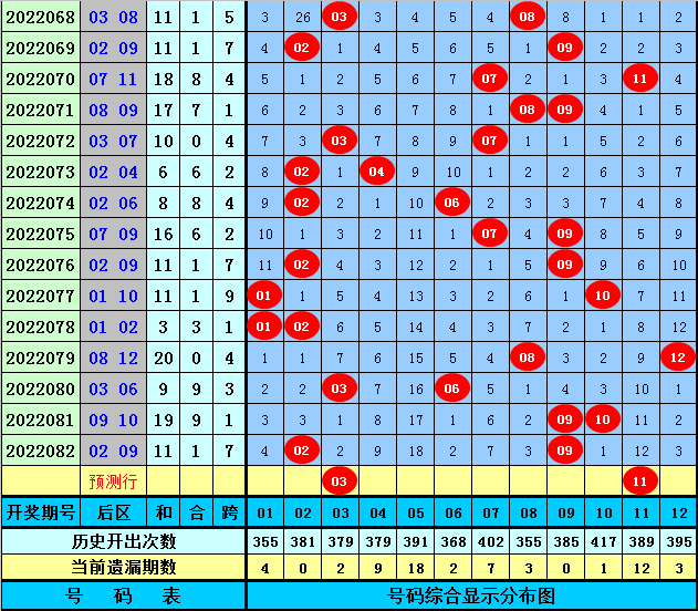 后区分析:上期开出奖号02和09为小号+大号、偶数+奇数。,最近10期后区奖号大小比为9:11,本期重防小号热出;奇偶比为8:12,本期注意奇数号码回补,关注号码03、11。