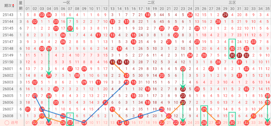 三区(25-35)分析:上期该区开出号码26,近10期占比30%,与上期相比-2%。本期无三斜连号趋势,无隔码斜连走势。